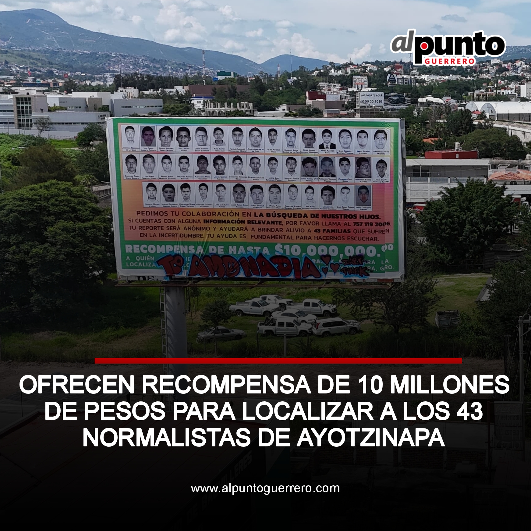 Chilpancingo, Gro., 16 de septiembre de 2024.- Desde la tarde del domingo, fueron colocados anuncios espectaculares en Chilpancingo en los que se ofrece una recompensa de 10 millones de pesos para quien brinde información sobre el paradero de los 43 normalistas de Ayotzinapa desaparecidos en Iguala.