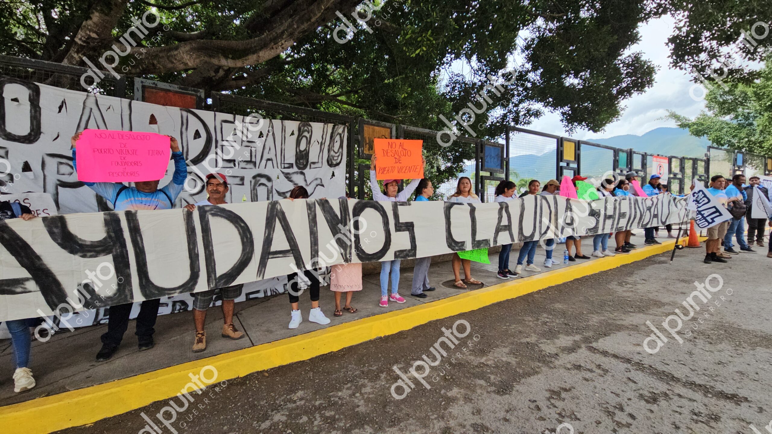 Con mantas que decían “Ayúdanos Claudia Sheinbaum” y “No al desalojo de Puerto Vicente Guerrero”, además de consignas como “No somos invasores, somos pescadores”, los manifestantes se mantienen a la espera de ser escuchados por la presidenta.