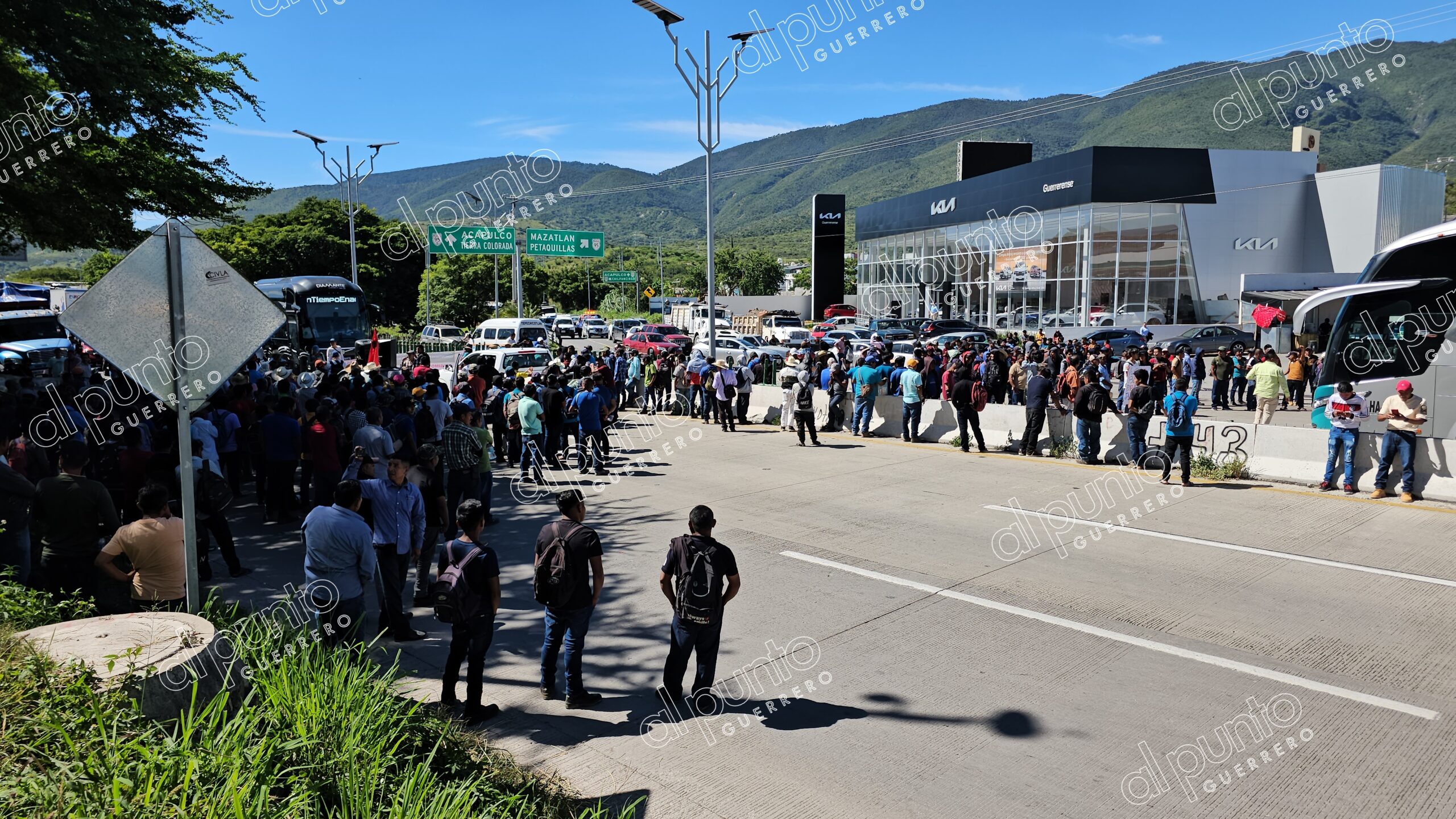 Integrantes de la Coordinadora Regional de Autoridades Comunitarias Policía Comunitaria (CRAC-PC) bloquean la Autopista del Sol a la altura del Parador del Marqués para exigir la liberación de Jaime Morales Castro, comisario de Coapinola e integrante de la agrupación y de otros 5 policías de Xalpatláhuac.