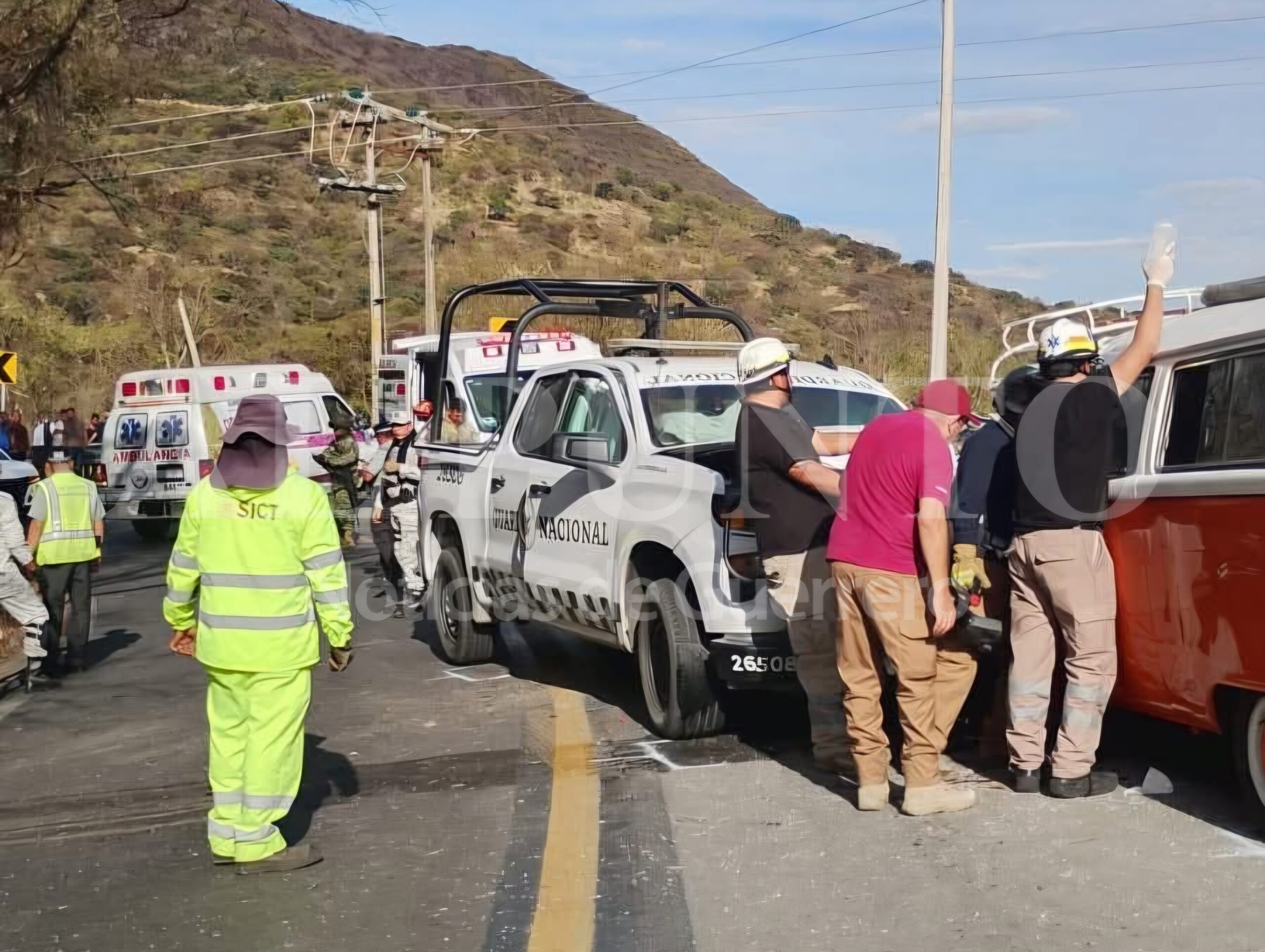 Pilcaya, Gro., 24 de enero de 2026.- Dos mujeres de la tercera edad muertas y al menos seis personas heridas fue el saldo de un aparatoso choque registrado sobre la carretera federal México-Acapulco, en el tramo Taxco-Ixtapan de la Sal, donde se vieron involucradas una camioneta de la Guardia Nacional y una combi particular.
